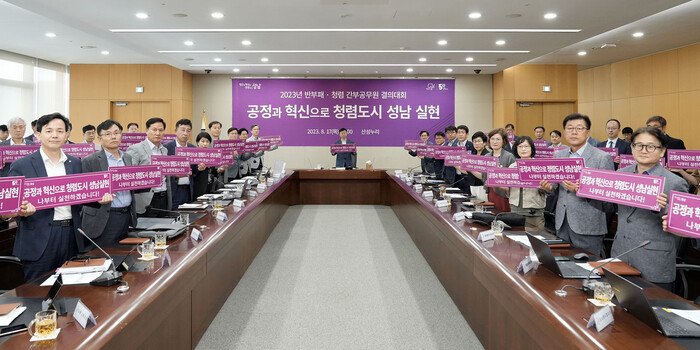 성남시는 17일 신상진 시장을 비롯해 간부 공무원과 산하기관 대표들이 참가한 가운데 반부패‧청렴 내용을 점검하고, 청렴 문화 구축과 청렴 조직문화를 대내외에 천명 및 확산하기 위해 ‘2023년 반부패‧청렴 결의대회’를 열었다.