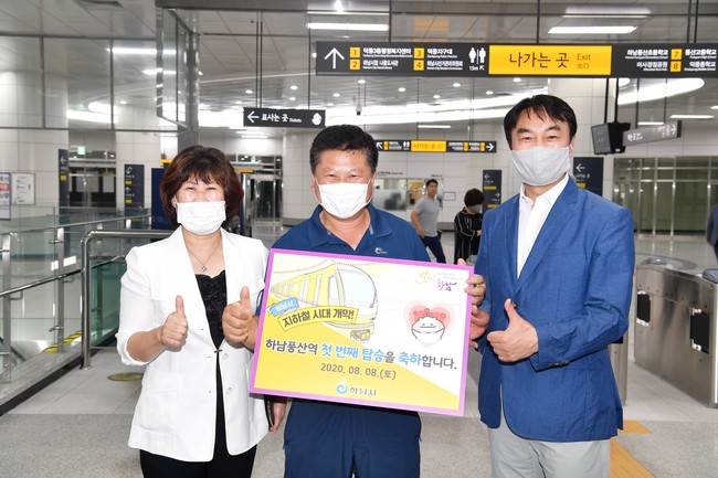 [로컬라이프] 김상호 하남시장은 지난 8일 하남풍산역에서 지하철 5호선 최초 운행을 기념하기 위해 첫차를 탑승하는 승객과 함께 지하철 운행을 축하하는 이벤트를 가졌다.