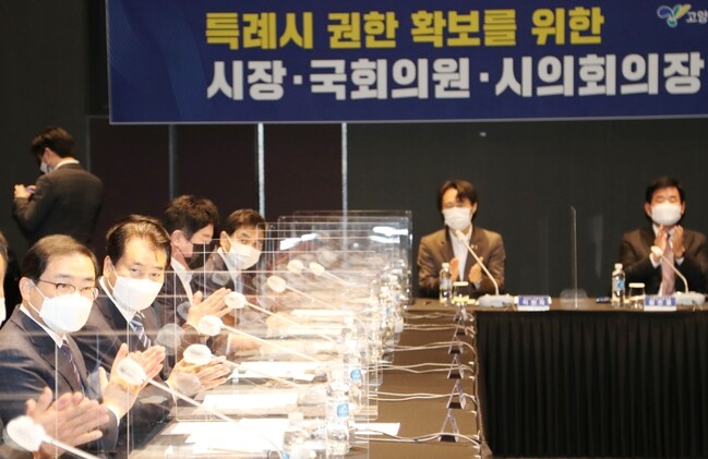 17일 백군기 용인시장, 이재준 고양시장, 염태영 수원시장, 허성무 창원시장과 정찬민·김민기·이탄희의원 등 해당 지역구 국회의원, 김기준 의장 등 시의회 의장들은 서울 여의도 글래드 호텔에서 ‘특례시 권한 확보를 위한 간담회’를 가졌다. 시장, 국회의원, 시의회 의장단이 함께 모인 건 이번이 처음이다.