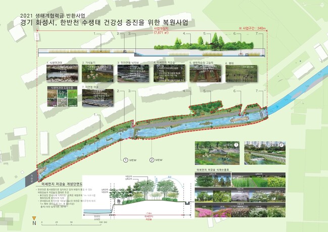 우선 한반천의 생태기능 회복을 위해 갈대, 억새, 부처꽃 등 식물을 활용한 자연 여과대를 조성하고, 자연형 여울 및 낙차보, 소생물 서식공간 등을 마련할 방침이다.