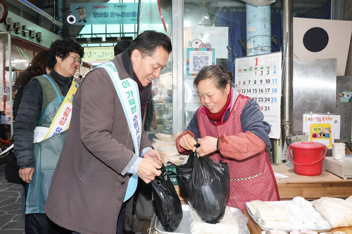 이재준 수원시장이 설을 앞두고 21일 구매탄시장에서 장을 보고, 상인들을 응원했다. 구매한 명절 음식과 물품은 관내 사회복지시설에 전달했다.