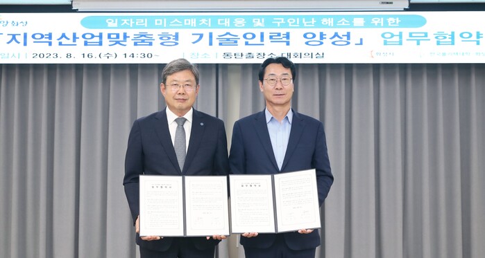 화성시(시장 정명근)가 16일 한국폴리텍대학교 화성캠퍼스와 지역일자리 미스매칭 대응과 구인난 해소를 위한‘지역산업맞춤형 기술인력 양성’ 업무협약을 체결했다.