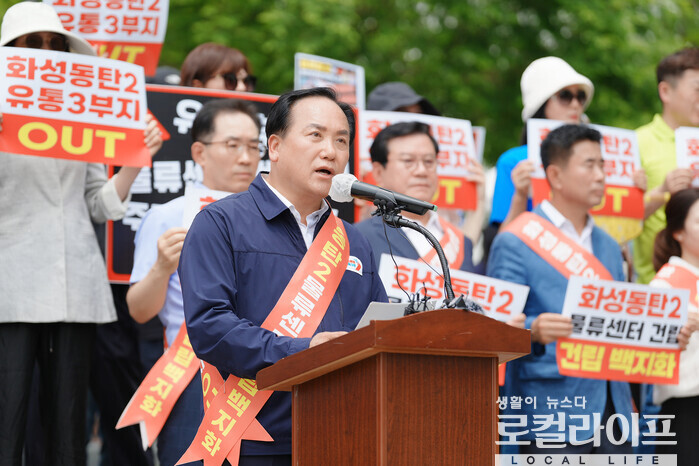 이어 "오산과 동탄 시민 모두의 일상과 안전에 큰 피해를 줄 수 있고 주민 의견을 외면한 채 일방적으로 밀어부치는 개발행정을 즉각 철회하라"며 "오늘 집회에 참석해 한 목소리로 초대형 물류센터 건립 반대의사를 밝혀준 오산·동탄 비상대책위원회 시민들과 지역 정치인 등 모든 분들께 감사한 마음 전한다"고 말했다.