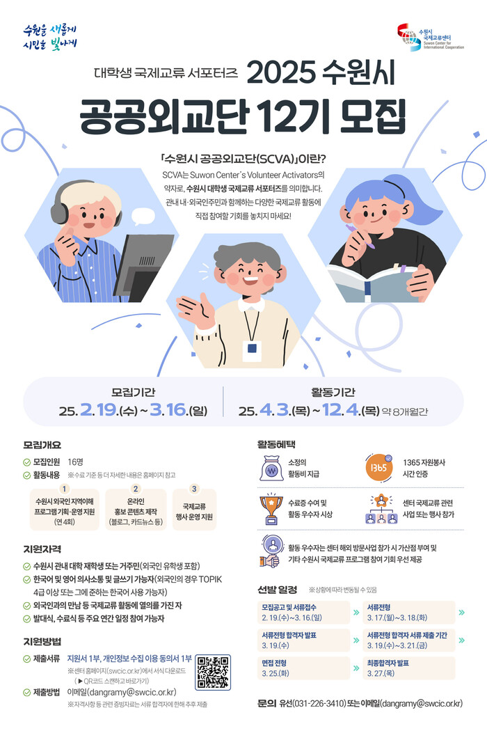 수원시국제교류센터가 3월 16일까지 ‘2025 수원시 공공외교단(SCVA) 12기’ 단원으로 활동할 대학생 16명을 모집한다.
