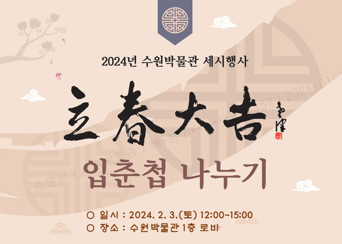 수원박물관 관계자는 “새해 첫 절기인 입춘을 맞아 전통 세시풍속을 시민들과 함께하기 위해 입춘첩 나누기 행사를 계획했다”며 “많은 시민분이 박물관을 찾아 한 해 복을 기원하는 ‘입춘첩 나누기’에 함께해 주시길 바란다”고 말했다.