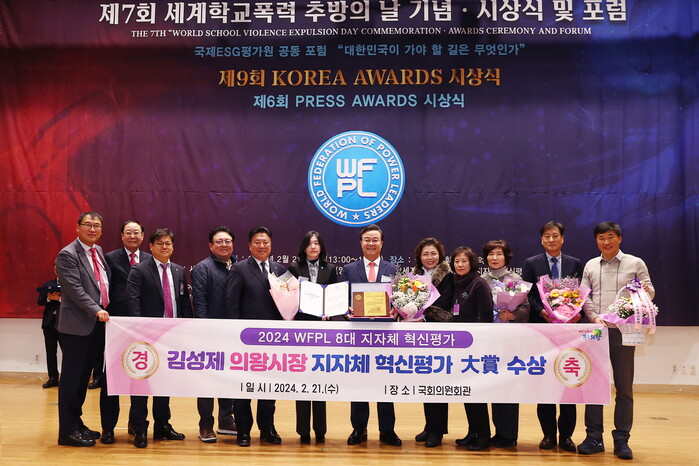 김성제 의왕시장이 2월 21일 국회의원회관 대회의실에서 열린 2024 WFPL 8대 지자체 혁신평가 시상식에서 ‘대상(大賞)’을 수상하는 영예를 안았다.