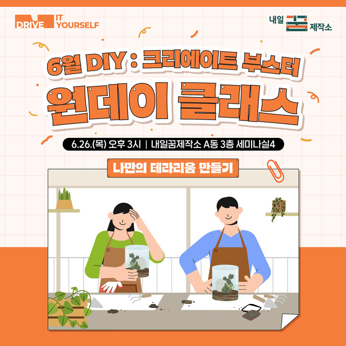 오는 26일 진행되는‘나만의 플라워 테라리움 만들기’원데이 클래스는 현재 절찬리 접수 중이다. 빠른 마감이 예상되니 내일꿈제작소 누리집에서 신청하거나, 내일꿈제작소 카카오톡 플러스 친구추가를 해두는 것도 방법이다.