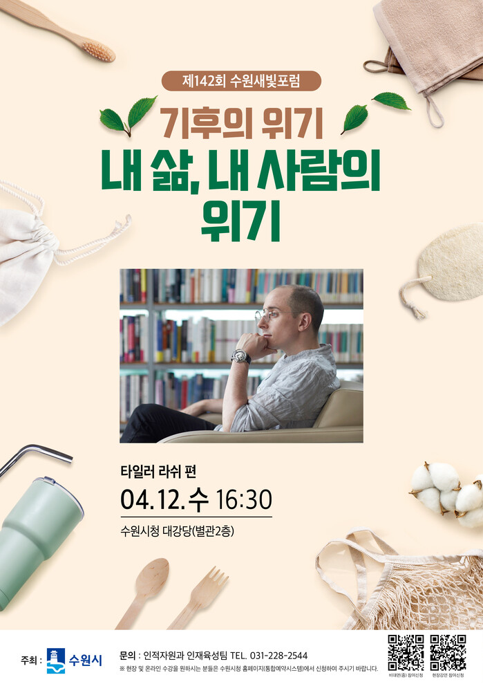 수원시는 4월 12일 오후 4시 30분 시청 대강당에서 ‘기후의 위기-내 삶, 내 사람의 위기’를 주제로 ‘제142회 수원새빛포럼 타일러 라쉬 편’을 개최한다.