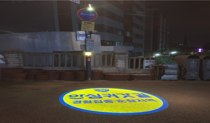 안심귀갓길에는 로고젝터로고젝터 : 바닥에 특정 로고나 문구를 투영해 주는 장치로, 로고와 프로젝터의 합성어.