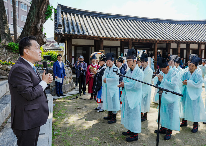 이재준 수원특례시장이 11일 수원향교 대성전에서 열린 ‘석전대제(釋奠大祭)’에 참석해 “석전대제를 주최해 주신 수원향교에 감사하다”며 “옛 성현들의 가르침을 본받고 인의예지를 행하는 석전대제를 통해 125만 수원시민의 안녕(安寧)을 빌어달라”고 밝혔다.