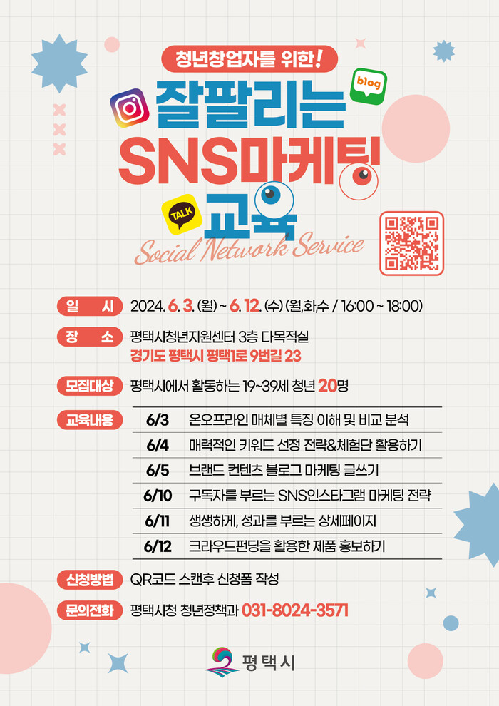 평택시(시장 정장선)는 지역 청년 창업자들을 위한 유용한 교육 기회를 위해 오는 6월 3일(월)부터 12일(수)까지 주 3회(월, 화, 수) 16:00~18:00에 평택시 청년지원센터 3층에서 사회관계망(SNS) 마케팅 교육을 진행한다.