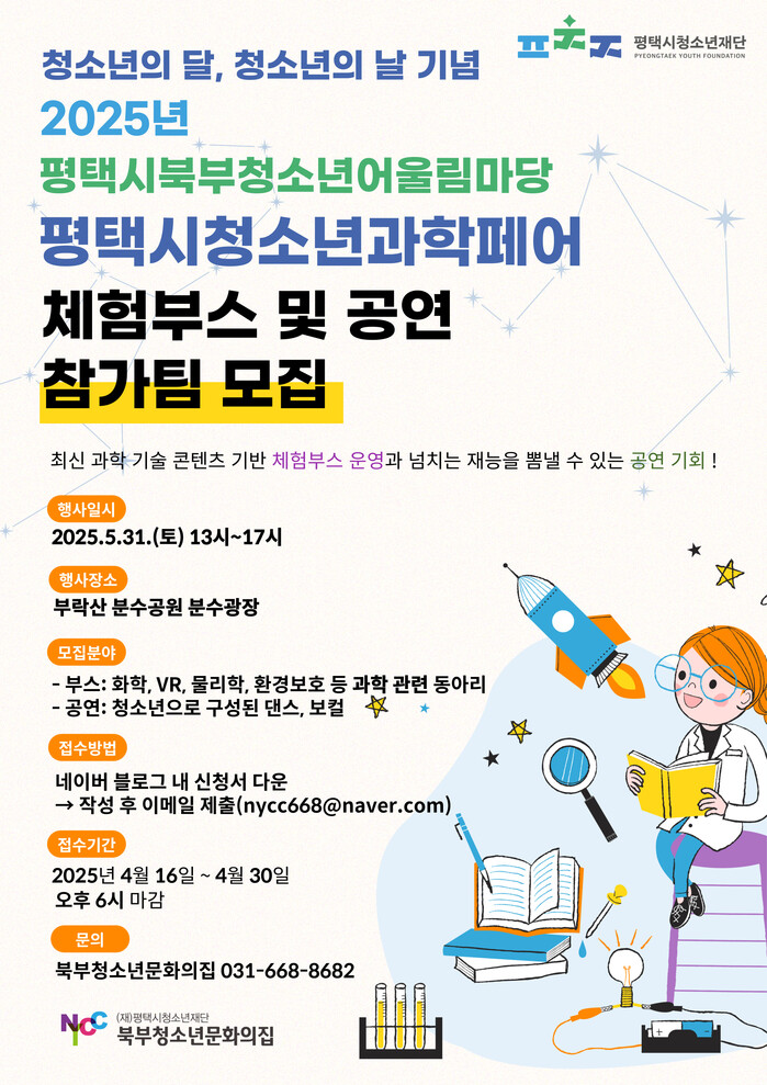 (재)평택시청소년재단 평택시북부청소년문화의집은 청소년의 달인 5월과 청소년의 날인 마지막 주 토요일을 기념해 5월 31일 진행되는 평택시북부청소년어울림마당 ‘평택시 청소년과학페어’ 부스 운영진과 공연 참가팀을 모집한다고 밝혔다.