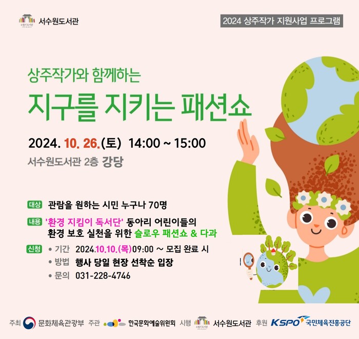 서수원도서관이 10월 26일 어린이들이 슬로 패션(지속가능한 옷)을 입고, 환경 도서를 낭독하는 ‘지구를 지키는 패션쇼’를 연다.