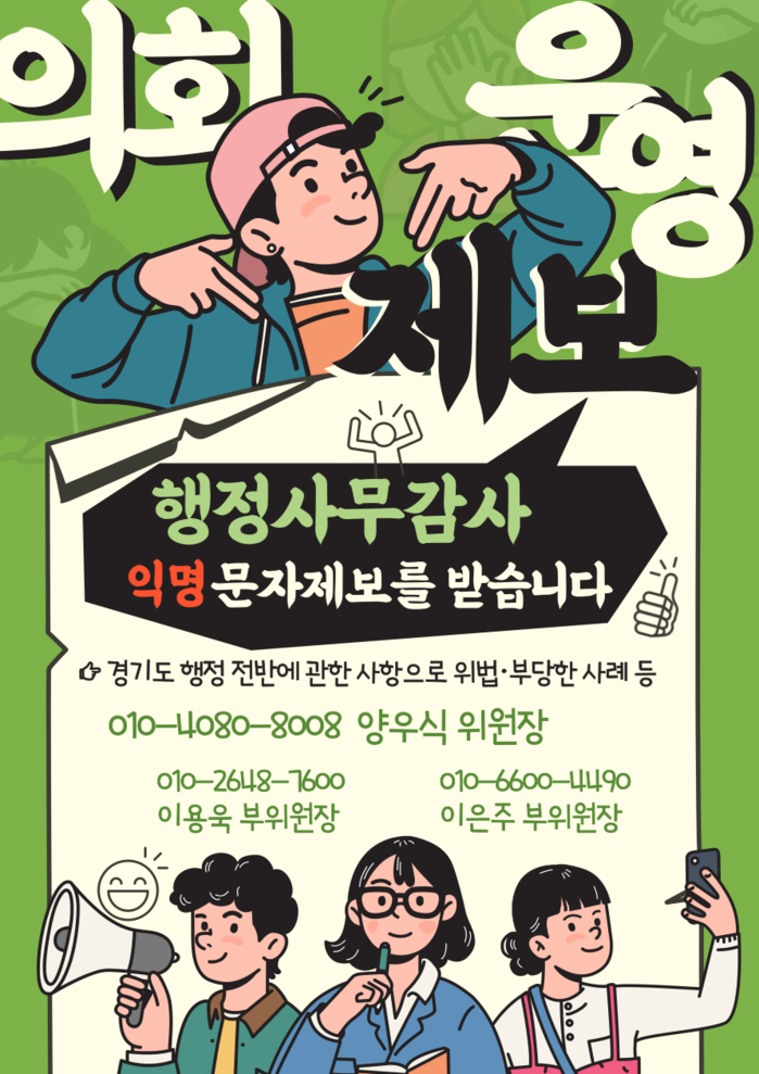 이용욱 부위원장은 “경기도의회의 기능이 집행부에 대한 견제와 감시이다. 시민 여러분들의 제보를 통해서 역량이 더욱 강화되지 않을까 하는 기대를 가지고 있다”며 “이번에 의미있는 행정사무감사가 되어 이를 통해 경기도의회의 의정과 행정이 더욱 발전했으면 하는 바램”이라고 말했다.