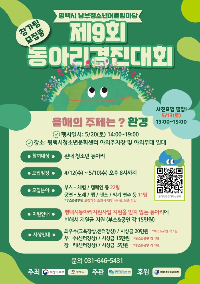 2023년 제1차 평택시 남부청소년어울림마당 <제9회 청소년동아리경진대회>는 ‘환경’을 주제로, 오는 5월 20일(토)에 개최된다.