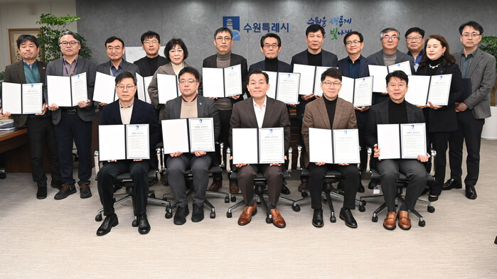 사진/이재준 수원시장(앞줄 가운데), 김현수 제1부시장(앞줄 왼쪽 2번째), 황인국 제2부시장(앞줄 오른쪽 2번째)과 간부 공무원들이 청렴행정 실천 서약서에 서명한 후 함께하고 있다.(사진제공=수원시)