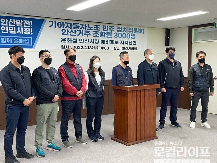 [안산=로컬라이프] 송준형 기자 = 기아자동차 노조 민주 정치위원회 안산거주 조합원과 더불어민주당 당원 3000명이 18일, 윤화섭 안산시장 예비후보(더불어민주당) 지지를 선언했다.