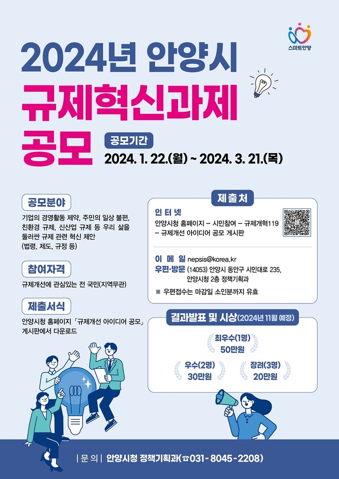 최대호 안양시장은 “시민들이 일상 또는 경제활동에서 겪은 불편에 대한 사소한 규제개선 아이디어가 안양시, 그리고 전국의 규제혁신에 큰 영감을 줄 수 있다”며 “많은 시민들의 적극적인 참여를 부탁드린다”고 말했다.