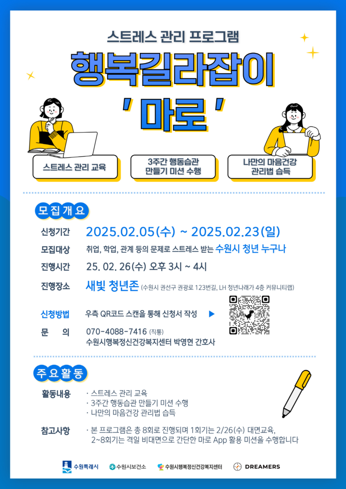 수원시행복정신건강복지센터 관계자는 “청년들이 정신건강을 스스로 점검하고 관리할 수 있도록 ‘행복길라잡이, 마로’ 프로그램을 마련했다”며 “많은 청년이 참여해 스트레스 관리법을 익히고 심리적 안정을 찾길 바란다”고 말했다.