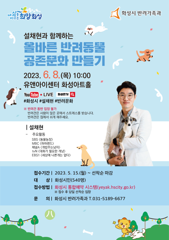 화성시(시장 정명근)가 오는 6월 8일 설채현 수의사와 함께하는 ‘올바른 반려동물 공존문화 만들기’특강을 개최한다.