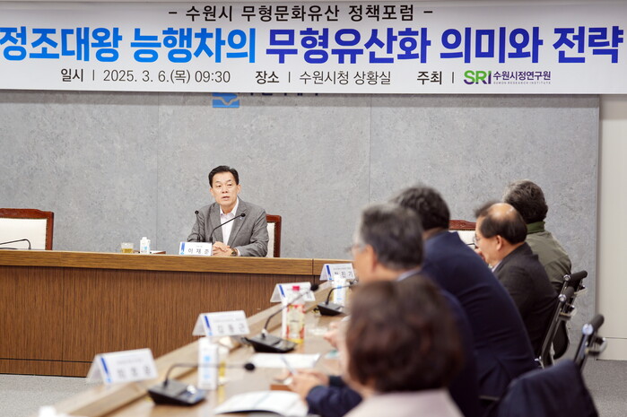수원시(시장 이재준)는 6일 시청 상황실에서 ‘정조대왕 능행차의 무형유산화 의미와 전략’을 주제로 ‘수원시 무형문화유산 정책포럼’을 열고, 정조대왕 능행차를 무형문화유산으로 계승·발전시키기 위한 방안을 논의했다.