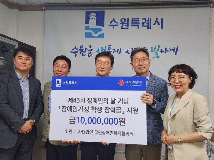 (사)국민장애인복지협의회가 “장애인 가정 유소년을 위한 장학금으로 사용해 달라”며 수원시에 1000만 원을 기부했다. 수원시는 장애인 가정 유소년 10명에게 1인당 100만 원씩 장학금을 배분할 예정이다.