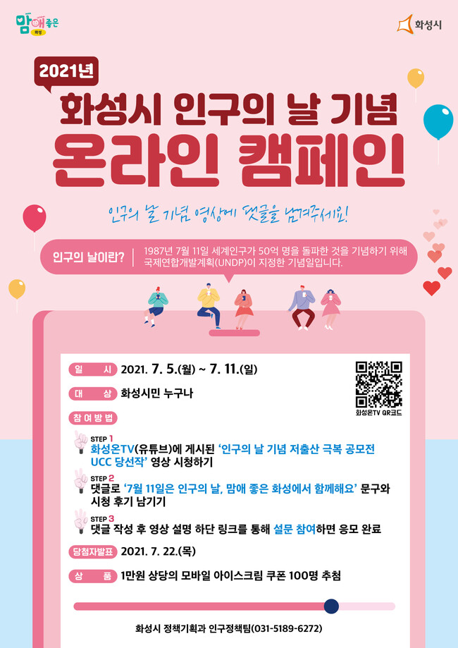 캠페인 참여는 화성시민이라면 누구나 가능하며, 화성온TV에 게시된 ‘인구의 날 기념 저출산 극복 공모전 UCC 당선작’을 감상 후 댓글을 남기고 설문에 참여하면 된다.
