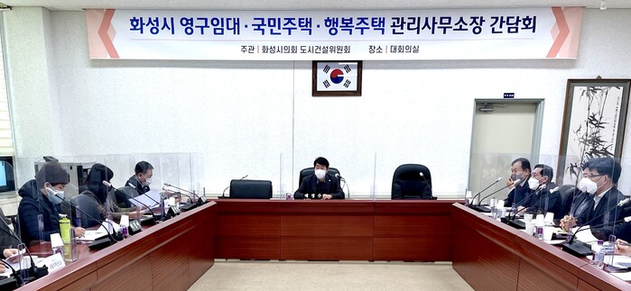 화성시의회 도시건설위원회 배정수 위원장과 소속위원 정흥범, 공영애, 박경아 의원은 7일 화성시의회 대회의실에서 공공임대주택 공동전기료 지원 관련 간담회를 가졌다.