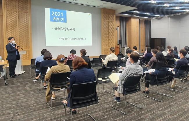 수원시가 12일 시청 중회의실에서 도시계획 관련 업무 담당자 등을 대상으로 ‘2021년 하반기 공직자 송무교육’을 했다.