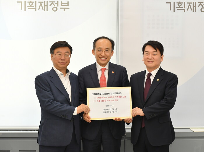 신상진 성남시장은 1일 오후 국회를 방문해 추경호 기획재정부장관, 안철수 국회의원과 만나 지하철 8호선 판교연장 사업과 위례삼동선 사업의 조속 추진을 요청했다.
