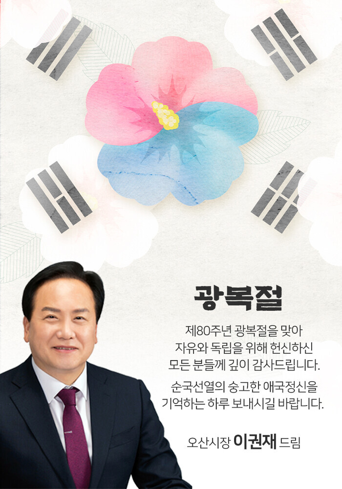 [오산=로컬라이프] 송준형 기자 = 이권재 오산시장은 15일, 광복 80주년을 맞아 자신의 페이스북을 통해 “오늘(15일)은 제80주년 광복절이다. 80년 전, 긴 어둠 속에서도 꺼지지 않던 희망의 불씨가 마침내 온 나라를 환히 밝히던 그날을 우리는 기억한다”며 “오늘 우리가 자유롭게 말하고 꿈꾸며 미래를 그릴 수 있는 것은 나라를 위해 모든 것을 바친 순국선열과 독립운동가들의 용기와 헌신, 그리고 이름 없이 싸운 수많은 독립군의 희생 덕분이다”라고 말했다.