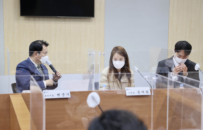 사진/백군기 용인시장이 청년들과 간담회를 갖고 청년들이 제안하는 다양한 정책에 대해 이야기 하고 있는 모습(사진제공=용인시)