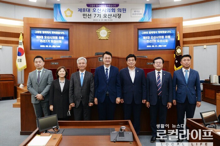 [오산=로컬라이프] 송준형 기자 = 민선7기로 3연임을 임기를 마감하는 곽상욱 오산시장이 제8대 오산시의회 의원들과 함께 작별 인사를 나누었다.
