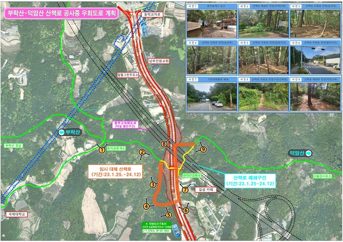 사업시행자인 브레인시티PFV(주)는 해당 공사 구간 내 기존 생태통로를 확장(L=15→30m) 설치하기 위해, 부득이 공사 기간 중 주민 안전 등을 고려하여 설 명절이 끝나는 오는 25일부터 2024년 12월 말까지 ‘부락산-덕암산 산책로 일부(지방도 317호선 생태통로 구간)’의 기존 생태통로 산책로를 폐쇄하고 대체 산책로로 변경하여 운영한다고 안내했다.