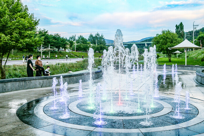 연일 무더운 날씨가 진행되고 있는 가운데, 지난19일 경기도 의왕시 학의천 분수대(학의로 486번지)에서 시민들이 가족들과 휴식을 취하며 산책을 즐기고 있다.