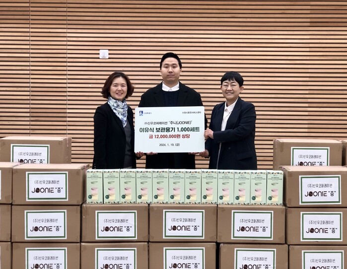 ㈜신우코퍼레이션이 19일 수원시휴먼서비스센터에 이유식 보관 용기 ‘주니(JOONIE)’ 1000세트(1200만 원 상당)를 기부했다.