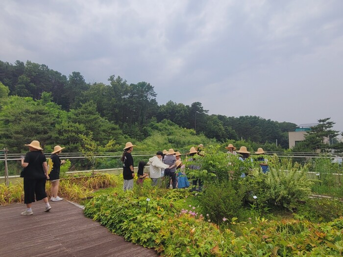 사진/‘아토피 건강캠프’ 참가자들이 정원텃밭 체험을 하고 있다.(사진제공=수원시)