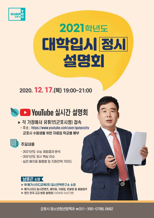 이번 설명회는 코로나19 예방을 위해 군포시청 유튜브를 통해서만 시청할 수 있다. 시는 관내 수험생들을 위한 입시 자료집을 학교별로 배부할 예정이다.