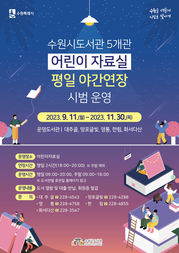 도서 대출이 많은 수원시도서관 5개 관(대추골·망포글빛·영통·한림·화서다산)이 11월 30일까지 어린이자료실을 연장 운영한다.