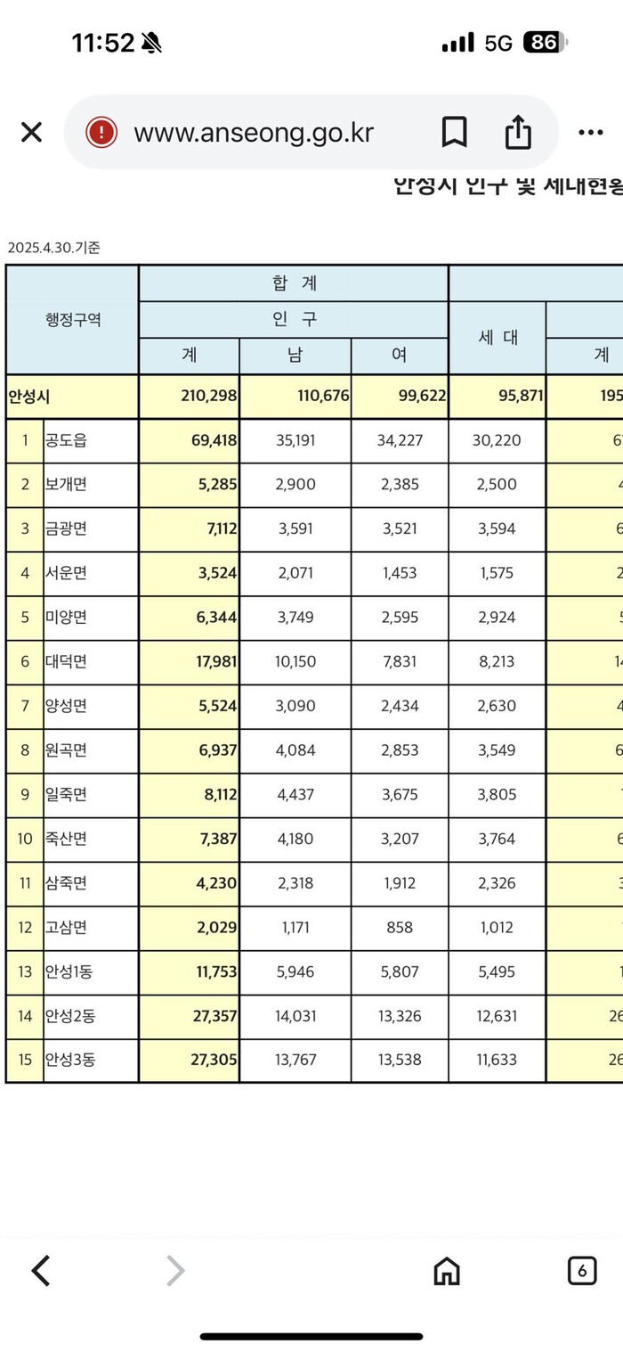 [안성=로컬라이프] 송준형 기자 = 안성시 인구가 2025년 4월말 기준으로 21만명을 넘었다.