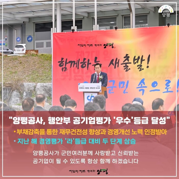 이는 지난해 '라 등급'대비 두 단계나 상승한 것으로 이번 경영평가에서 양평공사는 '부채 감축을 통한 재무건전성 향상', '경영 개선과 품질향상 노력'에 대해 평가단으로부터 호평을 받았다고 강조했다.