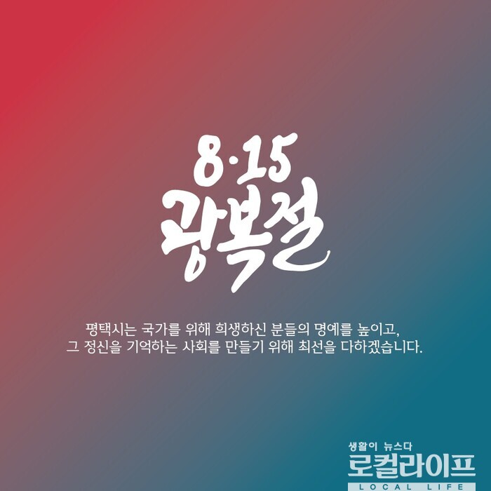 [평택=로컬라이프] 송준형 기자 = 정장선 평택시장은 15일, 광복 80주년을 맞아 자신의 페이스북을 통해 “광복은 저절로 오지 않았다. 이름 없이 스러진 수 많은 분들의 땀과 눈물과 피가 섞여 자유를 되찾았다”며 “그 자유 위에서 대한민국은 기적을 써 내려왔다”고 강조했다.