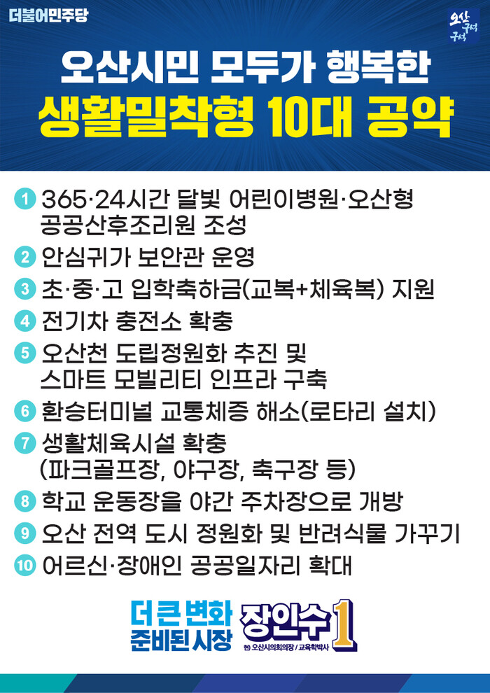 장 후보가 제시한 생활밀착형 10대 공약에는 ▲365·24시간 달빛 어린이병원 오산형 공공산후조리원 조성 ▲안심귀가 보안관 운영 ▲초·중·고 입학축하금(교복+체육복) 지원 ▲전기차 충전소 확충 ▲오산천 도립정원화 추진 및 스마트 모빌리티 인프라 구축 ▲환승터미널 교통체증 해소(로타리 설치) ▲생활체육시설 확충(파크골프장, 야구장, 축구장 등) ▲학교 운동장을 야간 주차장으로 개방 ▲오산 전역 도시 정원화 및 반려식물 가꾸기 ▲어르신·장애인 공공일자리 확대가 담겨있다.