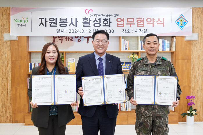 강수현 양주시장이 12일 오후 (사)양주시자원봉사센터 및 제3190부대와 자원봉사 활성화를 위한 업무 협약을 체결했다.