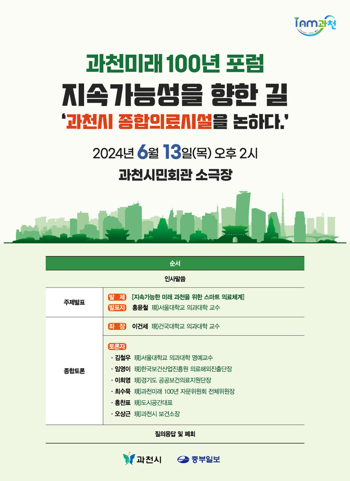 과천시가 3기 신도시인 ‘과천과천지구’에 종합의료시설 유치를 추진하고 있는 가운데, 오는 13일 과천시민회관 소극장에서 의료 분야 전문가와 학계, 시민 등이 참여하는 ‘과천 미래100년 포럼’을 연다.