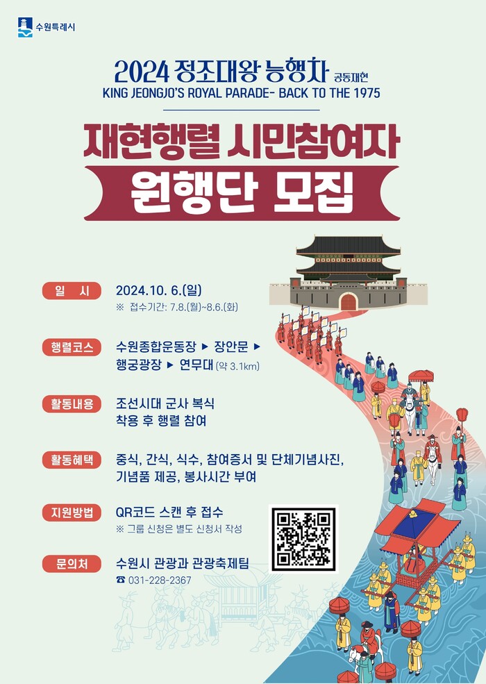 수원시(시장 이재준)가 ‘2024년 정조대왕 능행차 재현행렬’에 참여할 시민 참여자 ‘원행단’을 8월 6일까지 모집한다.