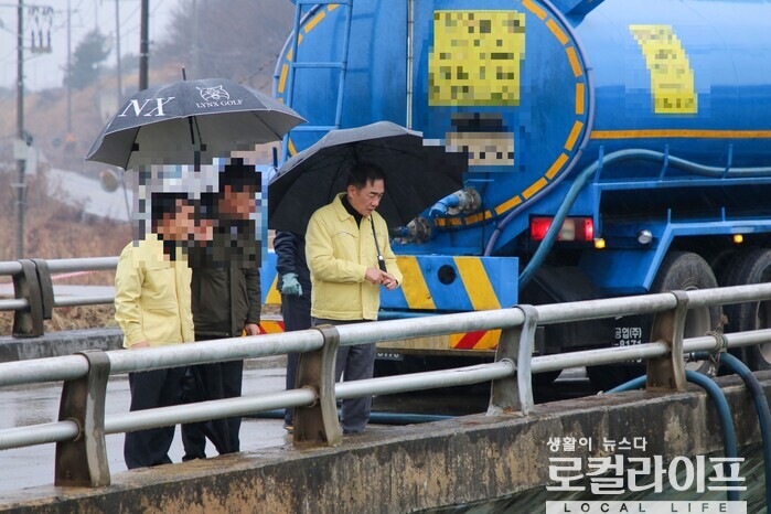 | ▲ 정장선 평택시장이 하천 위험물 유입 현장을 찾아 점검하고 있다. (사진출처=정장선 페이스북) |