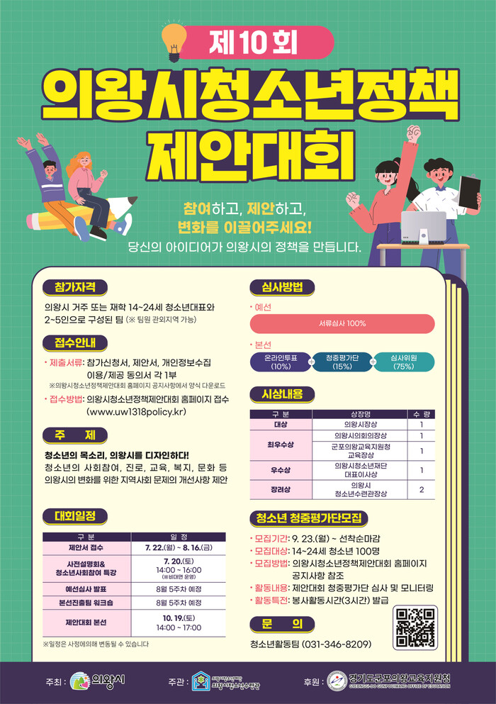 의왕시, 의왕시청소년수련관, 군포의왕교육지원청이 함께 진행하는‘의왕시청소년정책제안대회’는 청소년들의 아이디어가 정책으로 실현될 기회를 제공하기 위해 기획됐다.