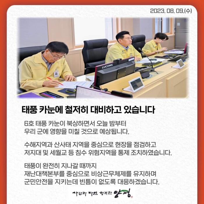 그러면서 군민여러분께서도 재난방송에 귀 기울여주시고, 태풍대비 요령을 살펴주시기 바란다고 강조했다.