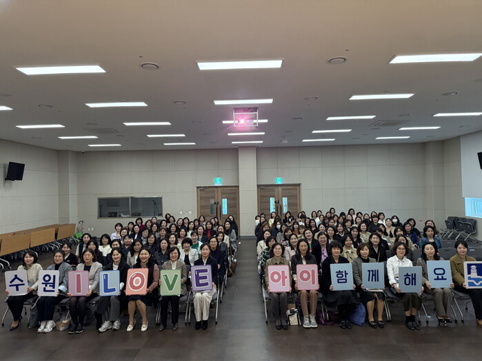 사진/지난 27일 열린 ‘2025년 국공립 등 어린이집 보육교직원 교육’ 참석자들이 단체 사진을 촬영하고 있다.(사진제공=수원시)